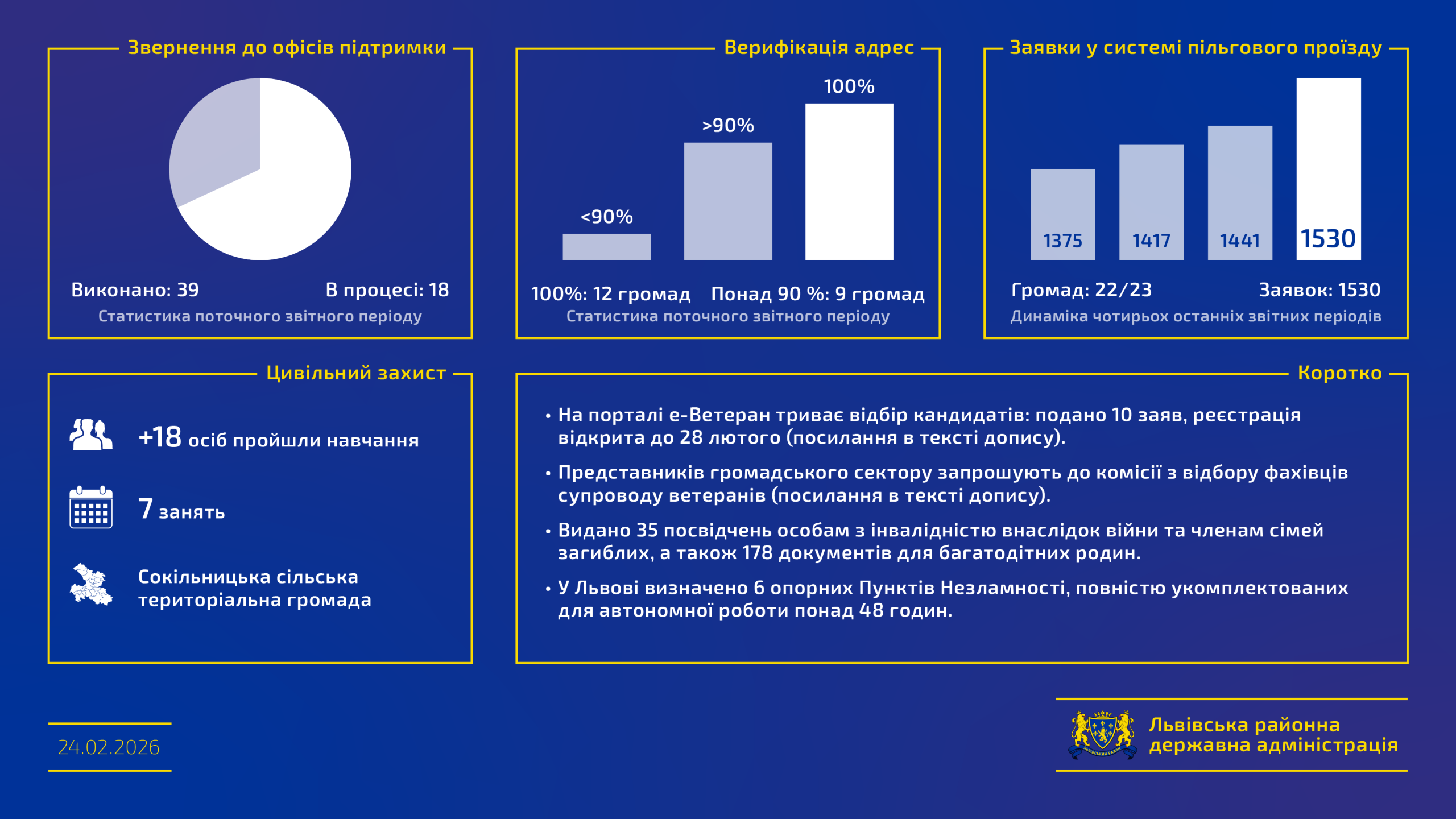 У Координаційних центрах при Львівській РДА опрацьовано 57 звернень (гуманітарна, медична та психологічна допомога), 39 із них уже закриті.