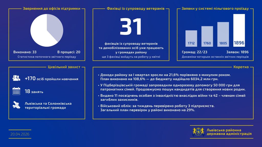 Фахівці супроводу: на сьогодні в районі вже працевлаштований 31 фахівець із супроводу ветеранів. До кінця місяця нові спеціалісти з’являться у Зимній Воді, Давидові та Жовкві.