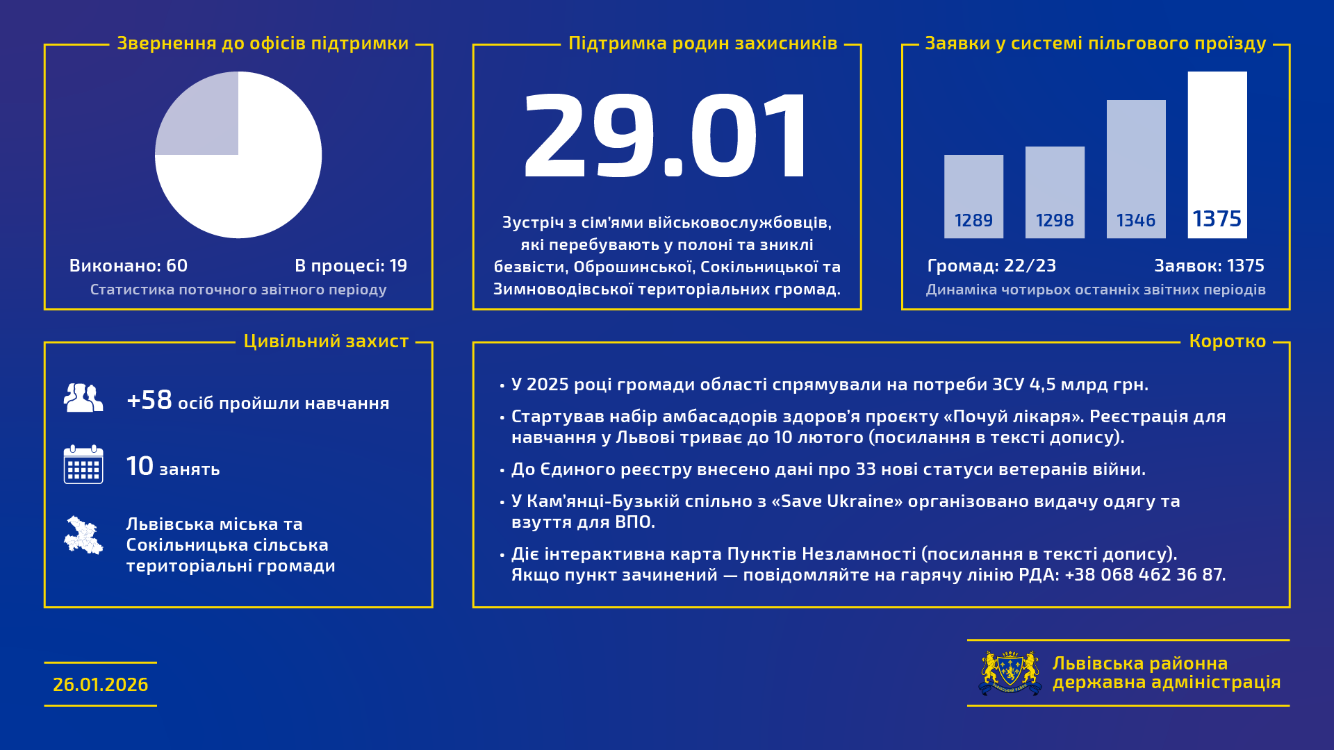 • Звернення громадян: Офіси підтримки цивільного населення опрацювали 79 запитів, 60 з яких уже успішно вирішено.