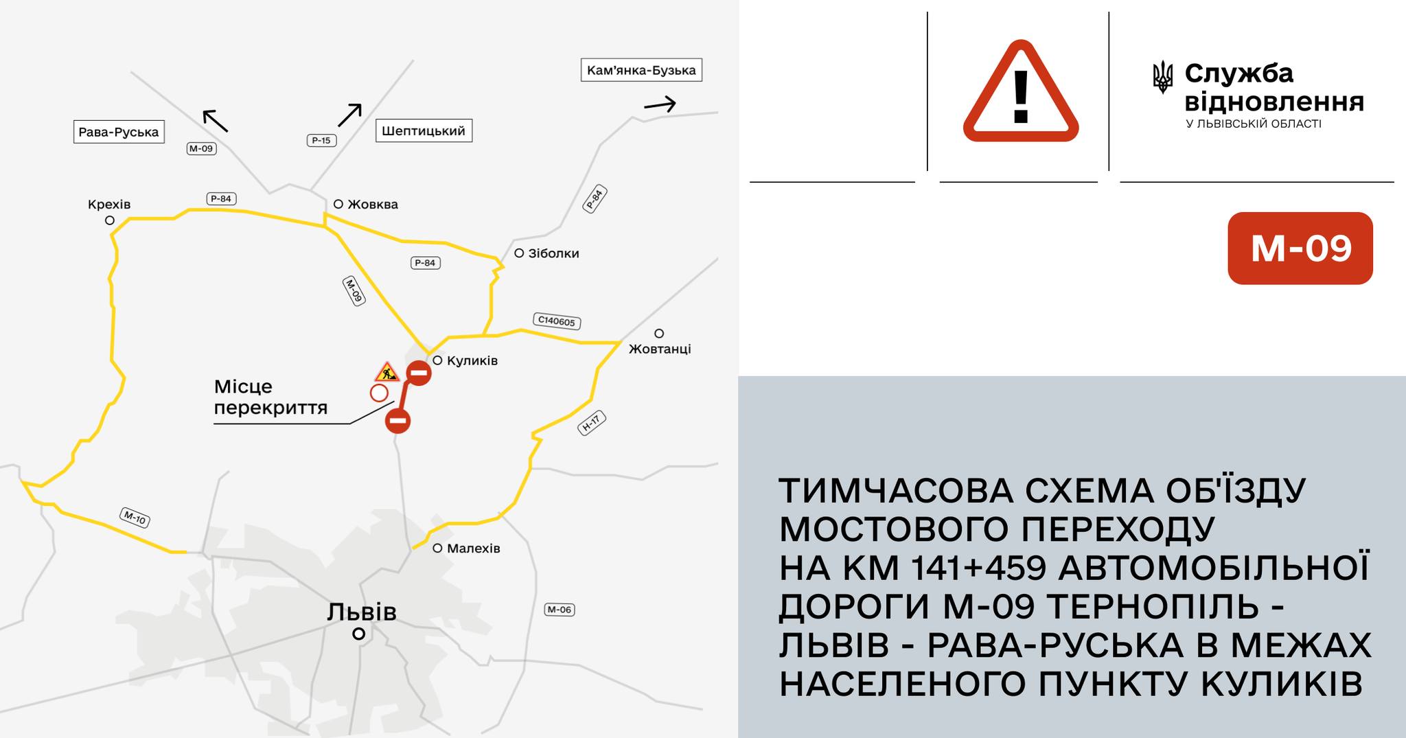 Служба відновлення та розвитку інфраструктури у Львівській області інформує про тимчасове перекриття руху транспорту через мостовий перехід на км 141+459 автомобільної дороги загального користування державного значення М-09 Тернопіль–Львів–Рава-Руська в межах селища Куликів.